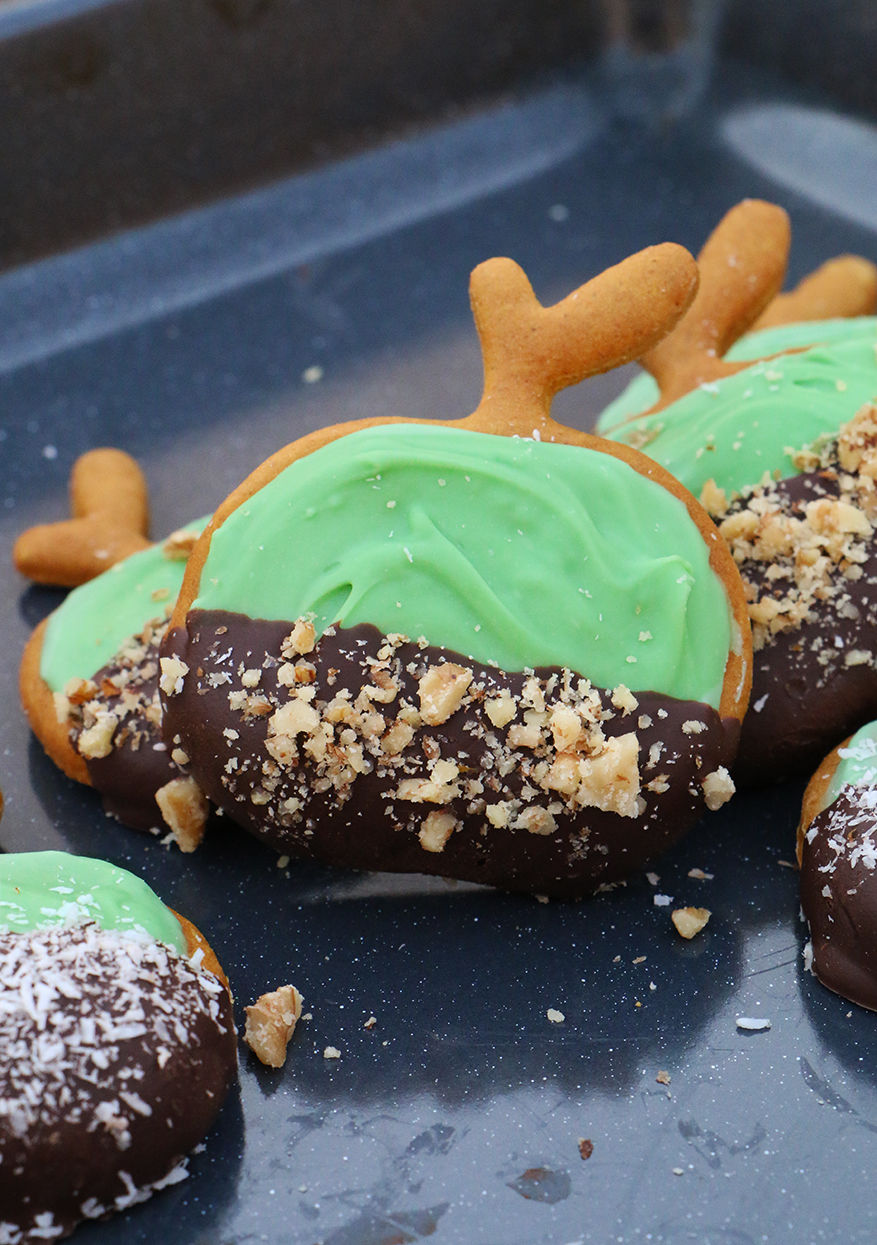 7. חותכים תפוחים בעזרת חתכני צורות, ומניחים על תבנית מכוסה בנייר אפיה. ומכניסים למקרר למשך 5 דקות.