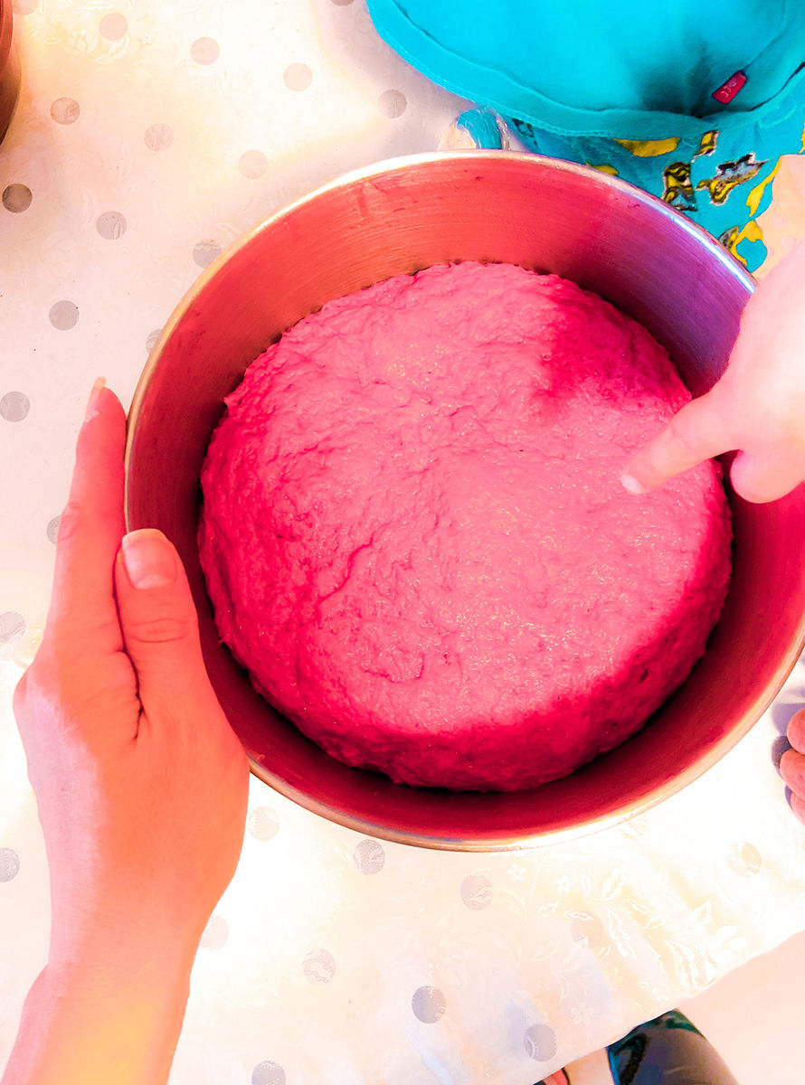 3. מתחילים להוסיף את המיץ סלק תוך כדי ערבוב, לא כדאי להוסיף את כל הנוזלים בבת אחת אלא להתחיל לערבב על מהירות גבוהה ולשים לב אם הבצק לא נדבק לדפנות הקערה - סימן שאין צורך להוסיך עוד נוזלים.