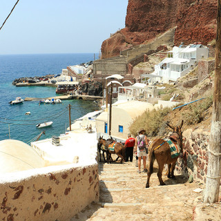 החיה הדומיננטית כאן היא החמור (המסכן). כל יום החמורים האלה עולים 400-500 מדרגות מהחוף ועד למעלה. וככה כל היום. האטרקציה היא להסיע את התיירים שאין להם כוח לעלות להר. אני באופן אישי נורא מרחמת על החיה הזאת ועלינו עם בעלי את כל ה500 מדרגות האלה ברגל (אחרי שגם ירדנו קודם). וב- Fira השתמשנו ברכבל (Cable car). אבל החמורים האלה ממשיכים לעבוד כמו חמורים במשך כל היום, מעמיסים עליהם סחורה וכל דבר אחר. בגלל שבמקום יש יותר חמורים מאשר מכוניות יש להם המון מזכרות של חמורים ואפילו בירה טעימה - Crazy Donkey.