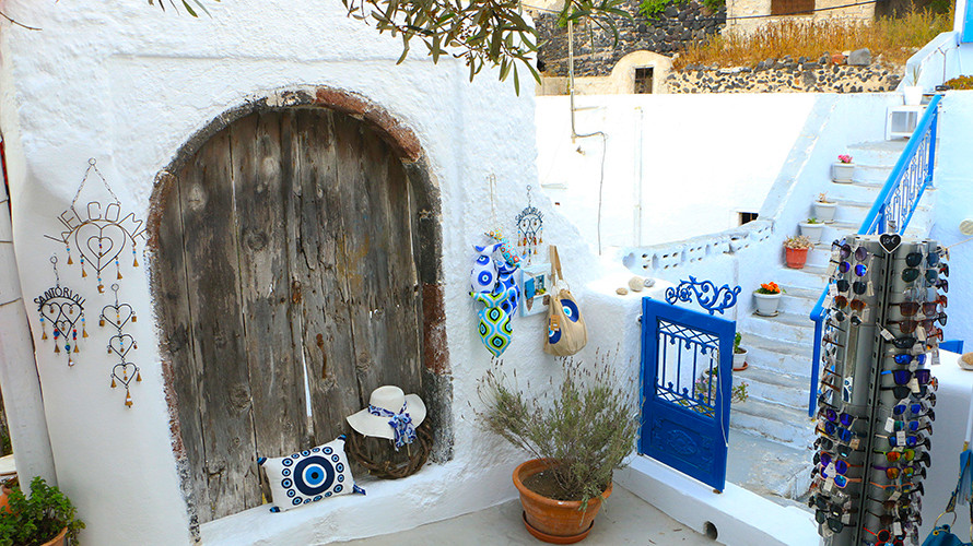 כל החנויות ב-Oia או Fira בין אם זה חנויות של מזכרות או בגדים נקראות גלריות Galeria. אין אצלם חנויות פשוטות, כולם אמנים וכל מה שמוכרים זה עבודת יד. חנויות מעצבים, אמנות בעץ, בקרמיקה וכו׳. בהתחלה קצת צחקנו שהאי קצת רחוק מהצביליזציה אבל כשהגענו לFira פתאום גילינו רחוב שלם של חנויות מותגים כמו Michal Cors ועוד. גם בסופרים גדולים לא נתקלנו, הכל מכולות קטנות פה ושם, רק אחד על הדרך מהעיר הגדולה פירה. קניונים לא פגשנו בכלל.